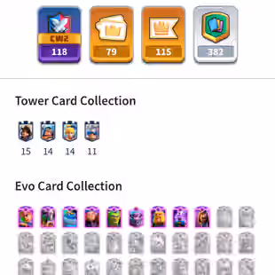 Konkurrencedygtig Udfordrer | 13-14 | 15-30+ (18 kort max til 21 kort max som eksempler) | 7000-8500+ | Flere Evo slots, godt udvalg af kort låst op, potentiale for sjælden emote eller skin. |