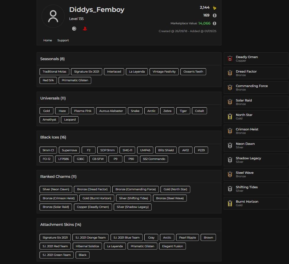 135 LVL - 16X BLACK ICES - 8X SEASONALS - 11X UNIVERSALS - 8X ELITES - 11X RANKED CHARMS - 68 OPERATORS - 2K RENOWN FA