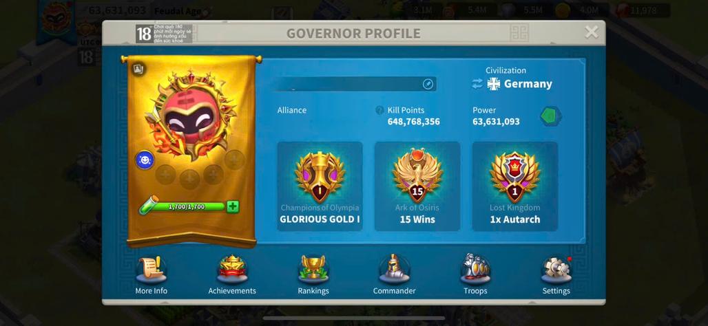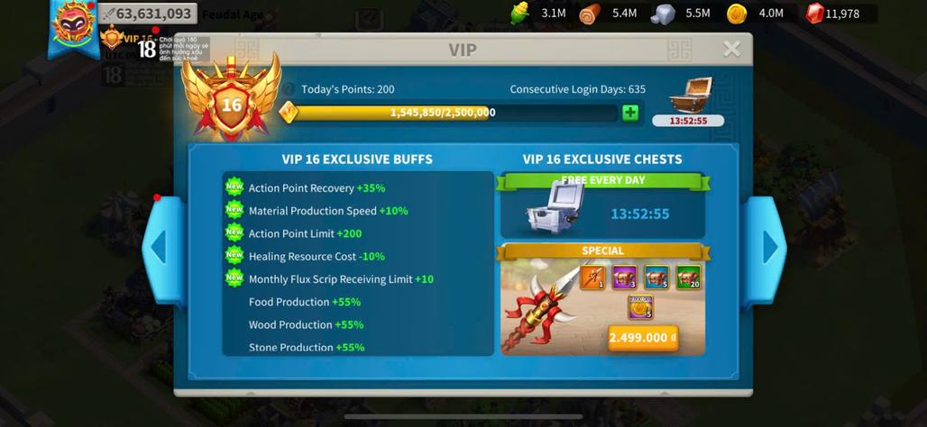 63M - Vip 16 - 3 T5 - Max 10 Commanders - 27 Passport - 2M7 Credit - 1 Skin - 2 Farm