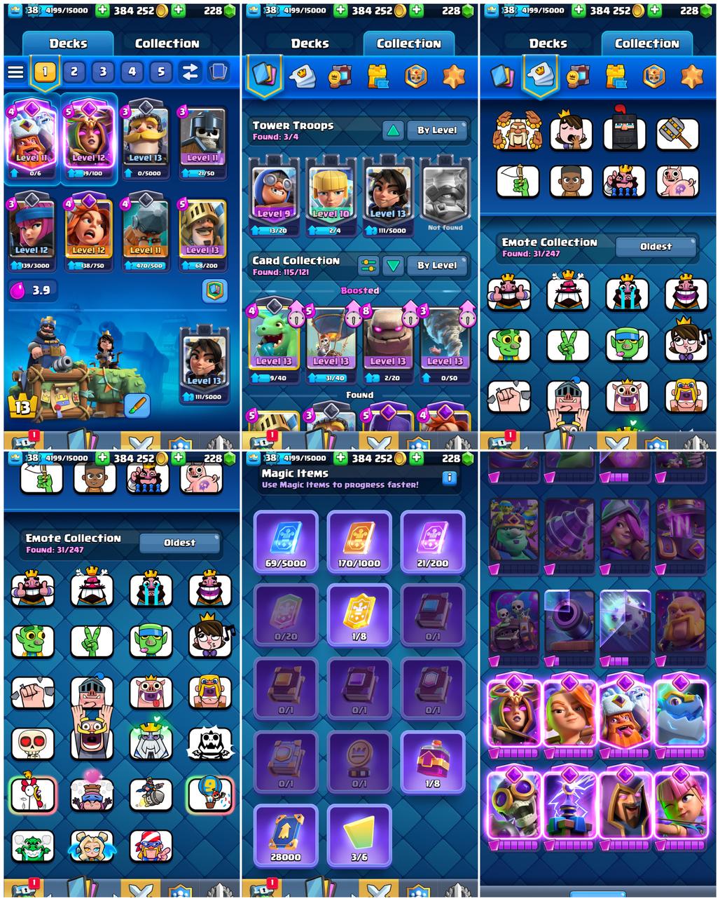 7216 Trophies | Level 38 | King Tower 13 | Arena 19 | Emote 31 Cards 115 | P556