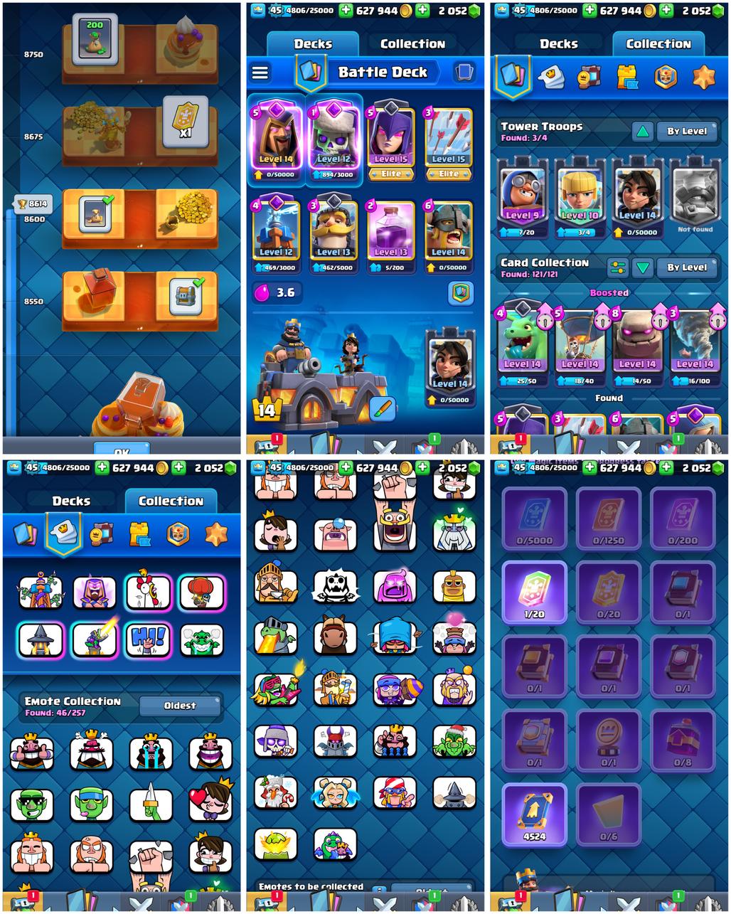 8614 Trophies | Level 45 | King Tower 14 | Arena 22 | Emote 46 Cards 121 | P598