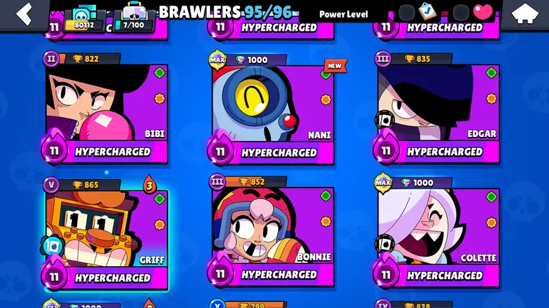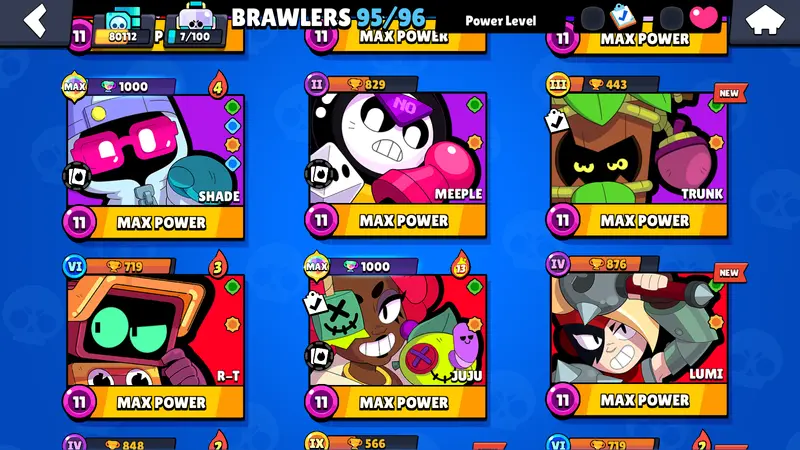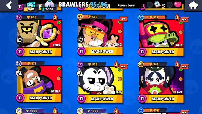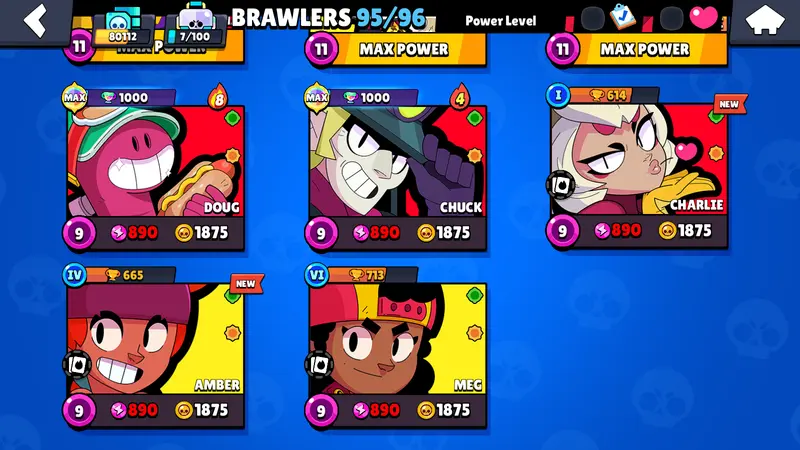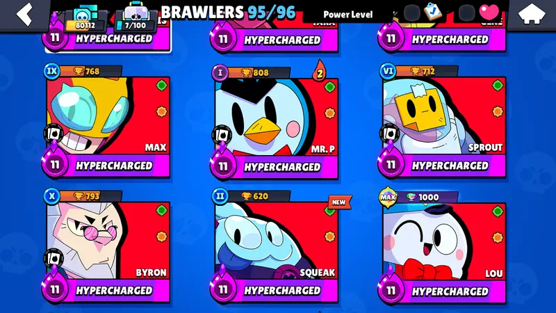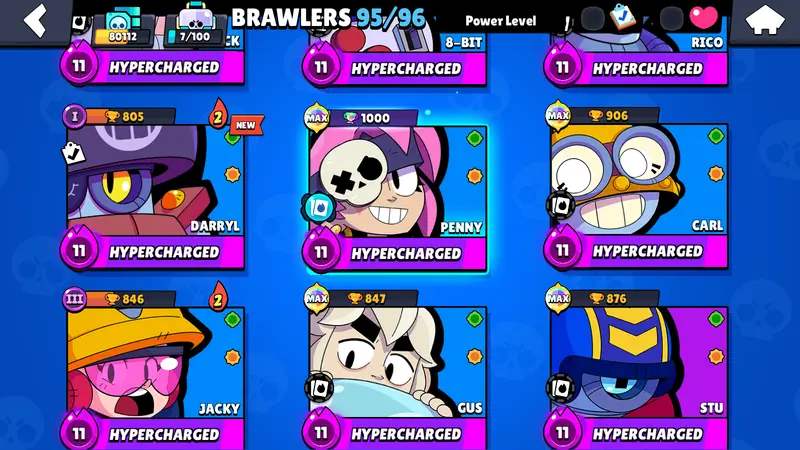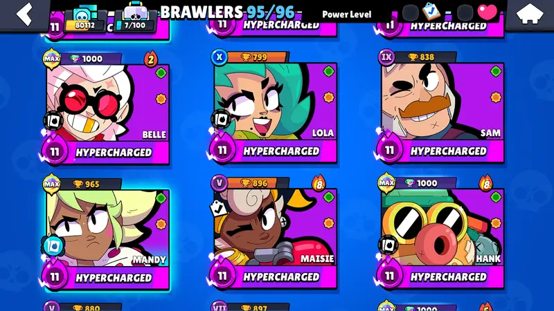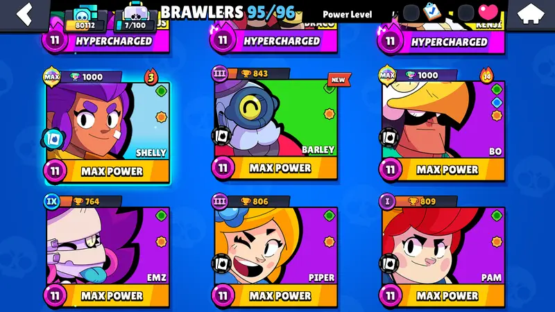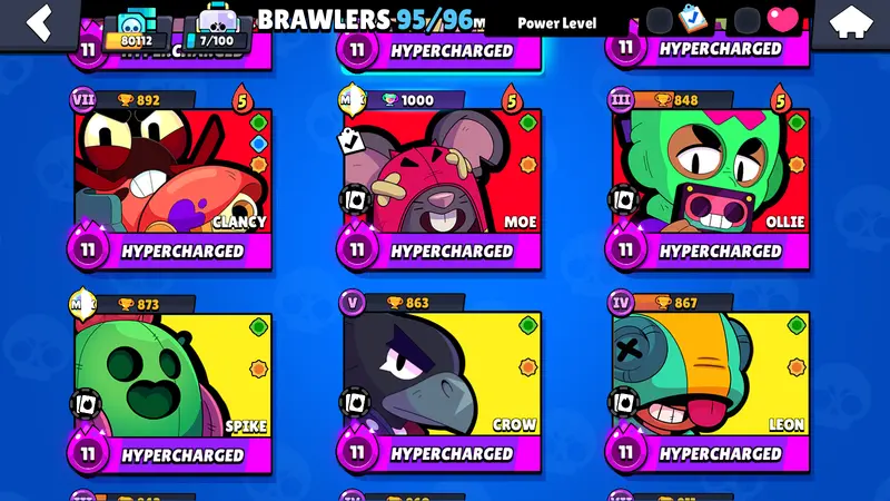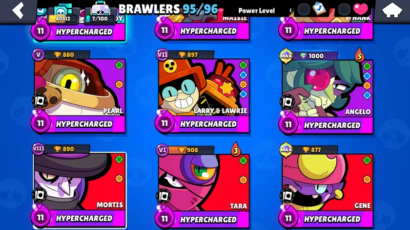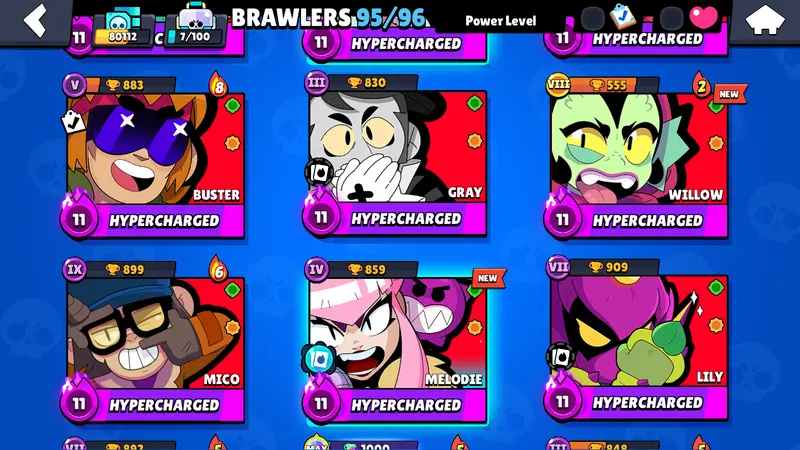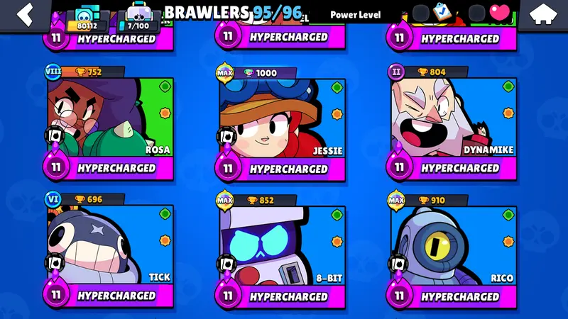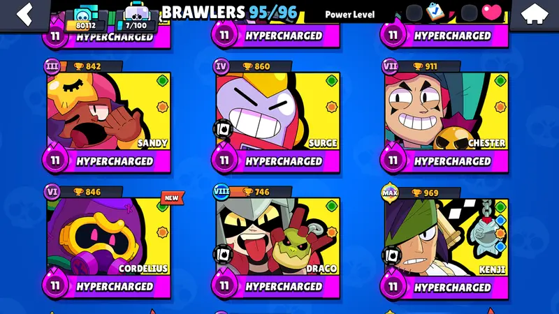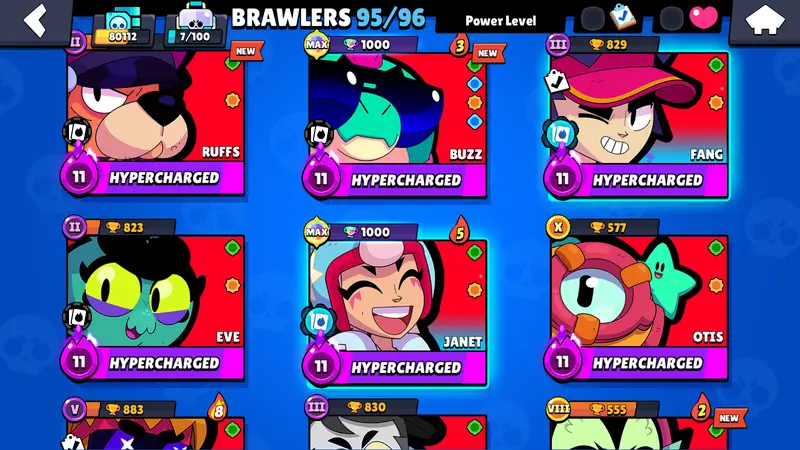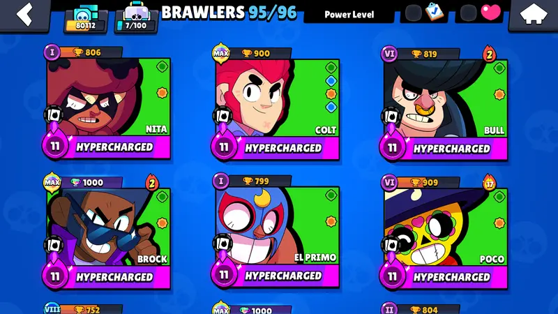 | 90 MAX BRAWLERS | 10 HYPERCHARGE SKINS | EXCLUSIVE | MATCHERINO PIN | 80000 CUPS | 95 BRAWLERS | 387 SKINS | INSTANT