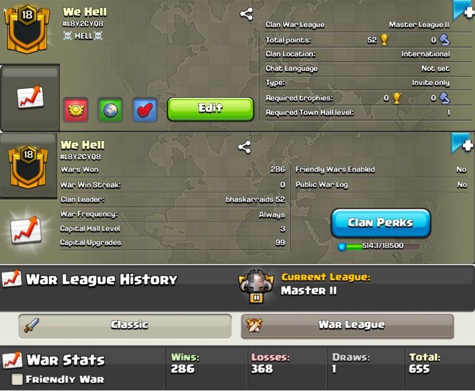 [] Clan Level--19 []💥Name--LOVE IS WAR💥[] Capital Hall-9 [] Positive War Log--Win-282 [] Lose only 112 []