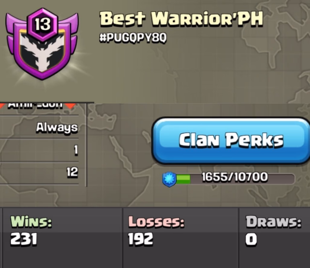 CHEAP💎NAME: Best Warrior'PH 💎LEVEL: 13 [] CAPITAL HALL: 1 [] WAR LOG: 231-192 []Unranked league [] AVAILABLE