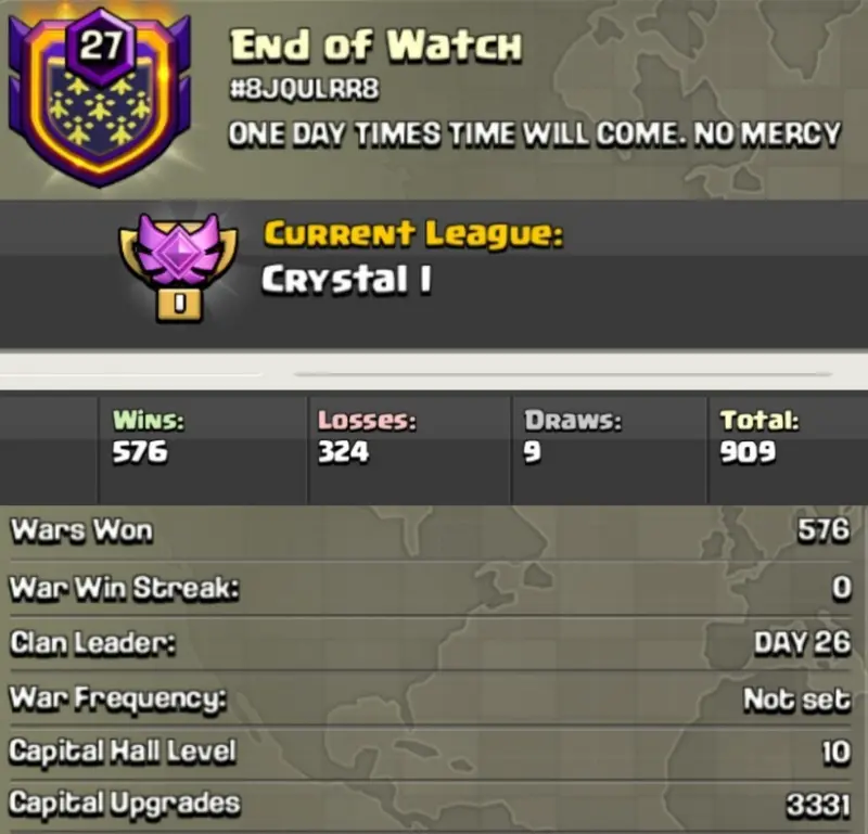 End of Watch 🇺🇸 LEVEL: 27 💎 CAPITAL HALL: 10 [] WAR LOG: 576-324-9 [] CWL: Crystal I
