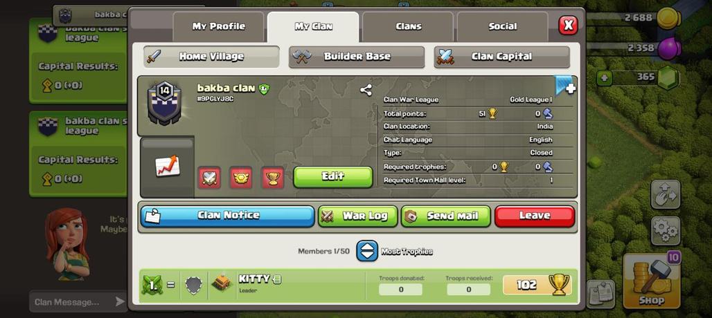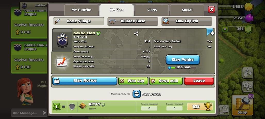 LEVEL 14 [] CLAN NAME: BAKBA CLAN [] CAPITAL HALL: 2 [] WAR WON: 284 [] CWL: GOLD 1