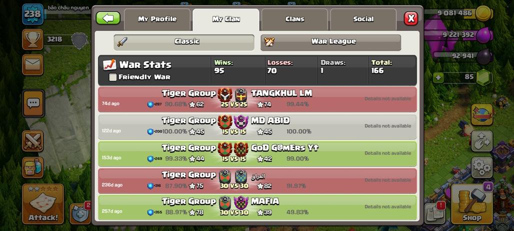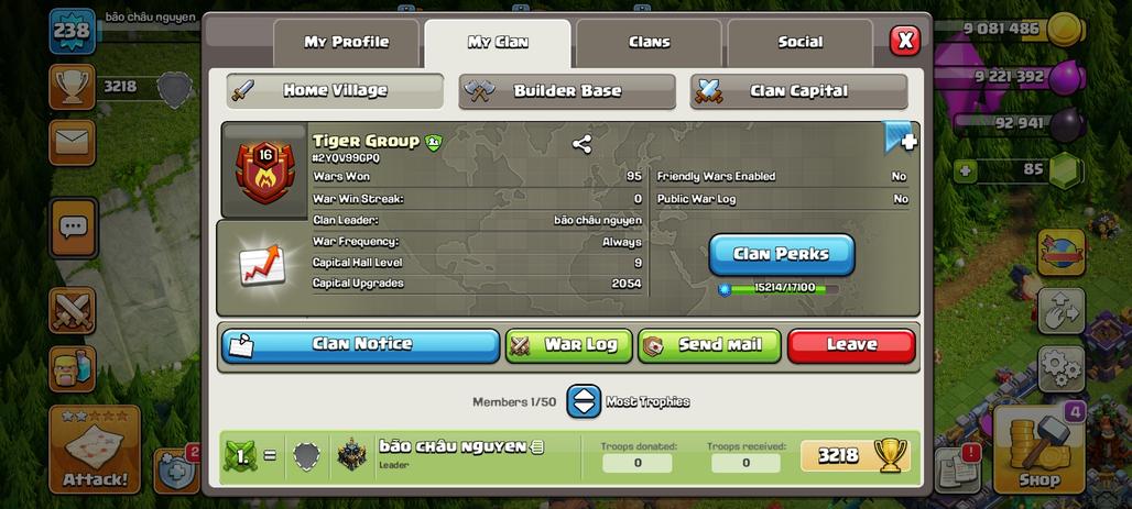 LEVEL 16 || NAME: Tiger Group || CWL LEAGUE: CRYSTAL 3 || CAPITAL HALL LEVEL: 9.9 || BEST WAR LOG || INSTANT DELIVERY