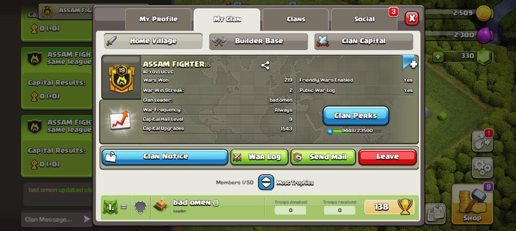 LEVEL 19 [] CLAN NAME: ASSAM FIGHTER [] CAPITAL HALL: 9 [] WAR WON: 219 [] CWL: CRYSTAL 2