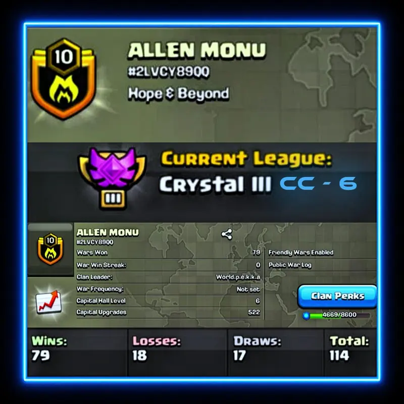 Level 10 Clan: ALLEN MONU! Boasting an impressive Warlog with 79 wins and only 18 losses, this clan is a testament to strategic prowess and teamwork. Currently competing in Clan War Leagues at Crystal 3 level, ALLEN MONU is a force to be reckoned with. The Clan Capital is at level 6, providing robust facilities for all members. With perks totaling 4600:8600, this clan offers significant advantages and opportunities for growth. Join a clan that combines experience with ambition!