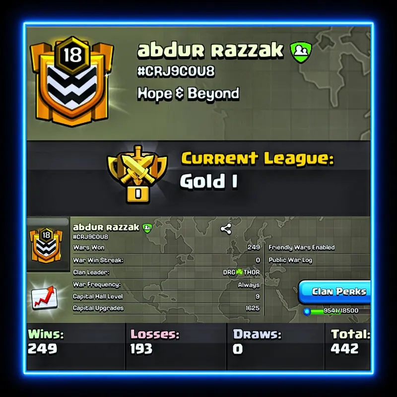 Level: 18 | Abdur Razzak | Human Name Clan | CWL: Gold 1 | Clan Capital Level 9 | War Log: 249 Wins, 193 Losses | Clan Perk: 9500/18500