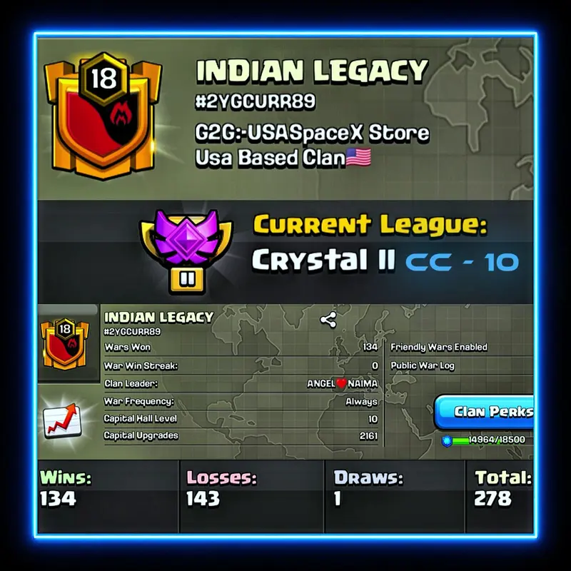 LvL 18 !! INDIAN LEGACY !! Indian Based Clan !! Clan Capital 10 !! Cwl: Crystal 2 !! Warlog 134 Win 143 Loss !!