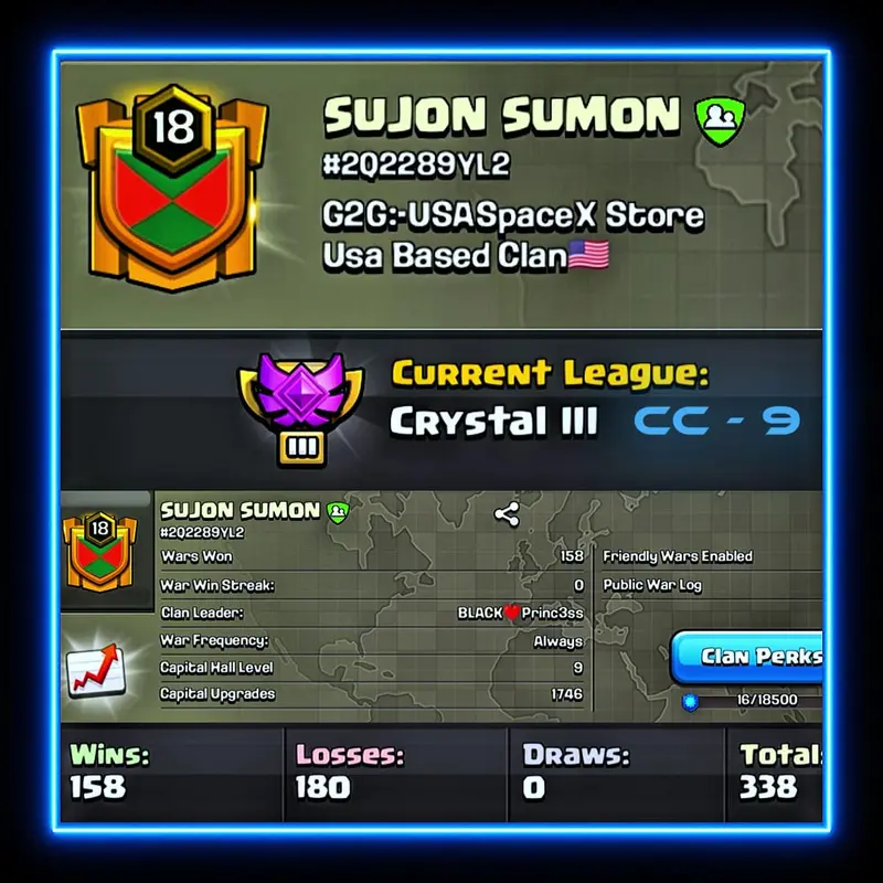 LvL:18 !! SUJON SUMON !! Personal Name Clan Nc Chances !! Clan Capital 9 !! Cwl: Crystal 3 !! Warlog 158 Win 180 Loss