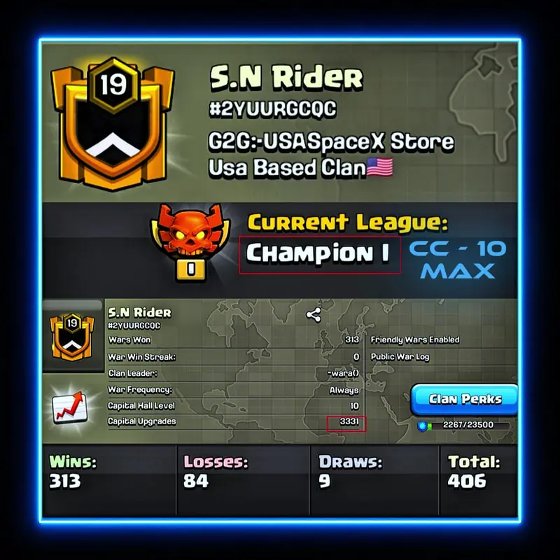 Level 19 Account with SN RIDER and CHAMPION 1 Status. Fully Maxed Clan Capital at Level 10. Impressive Warlog Record with 313 Wins and 84 Losses. Enjoy Perks totaling 2200:23500. Seize this Best Deal Ever for an exceptional gaming experience in Clash of Clans!