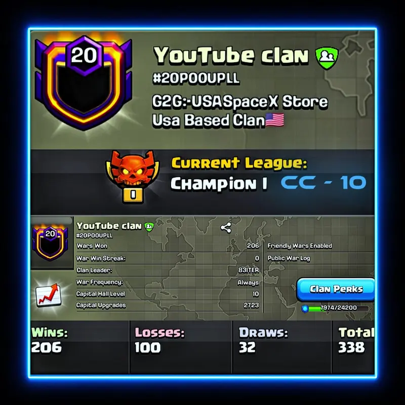 Join our elite Level 20 YouTube Clan and compete at the highest level in Clan War Leagues, achieving Champion 1 status. Our Clan Capital is a formidable level 10 stronghold, ready for strategic dominance. Review our stellar war log, boasting 206 wins against just 100 losses, a testament to our skilled and dedicated members. Unlock exclusive perks with our impressive score of 7900:24200. Become part of our vibrant, thriving community today and elevate your Clash of Clans experience!
