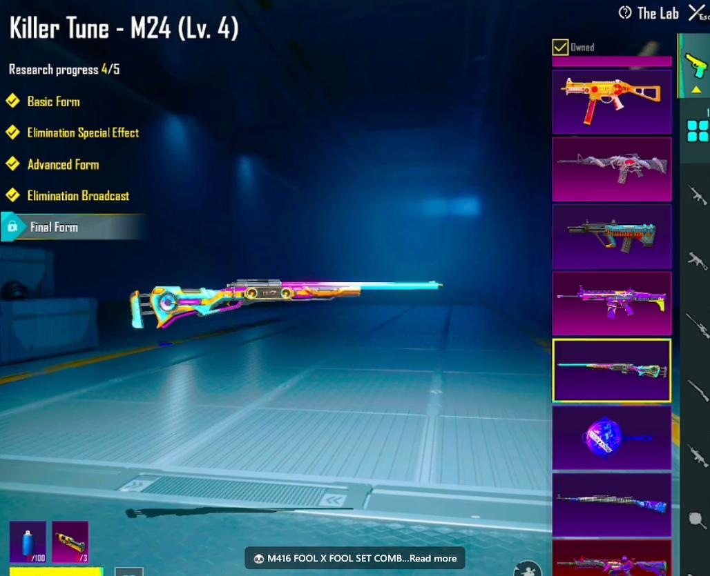 M416 Glacier, UMP Glacier, AKM Glacier, Vector Glacier, S12K Glacier, M762 Glacier, M24 Pharaoh, AWM Pharaoh, Kar98k Pharaoh