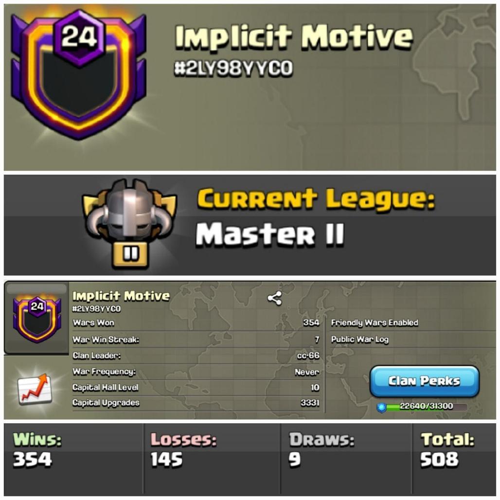 Name -Implicit Motive ||Level 24 clan || clan capital 10 maxed 3331 upgardes || master 2 || warlog 354-145