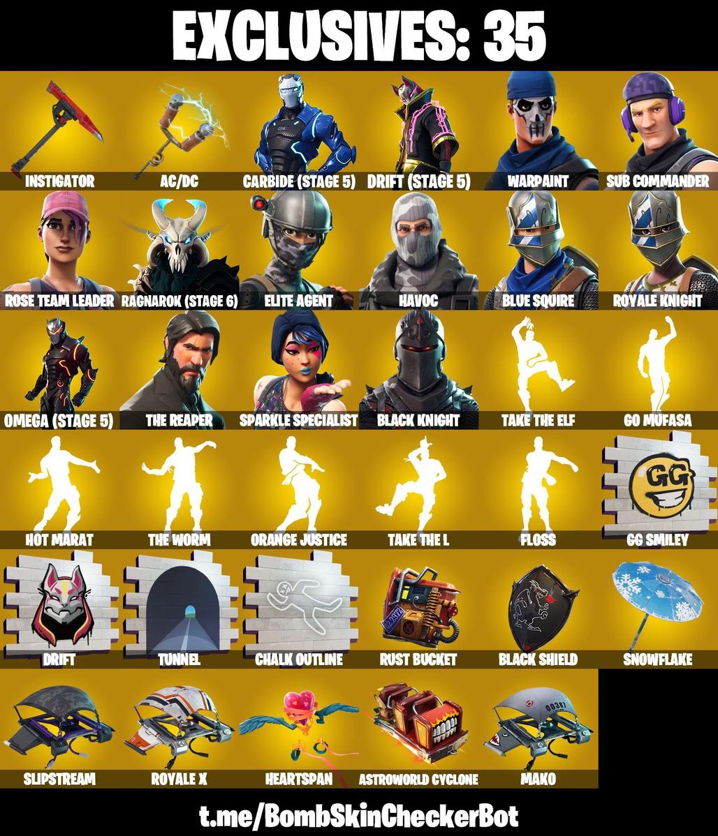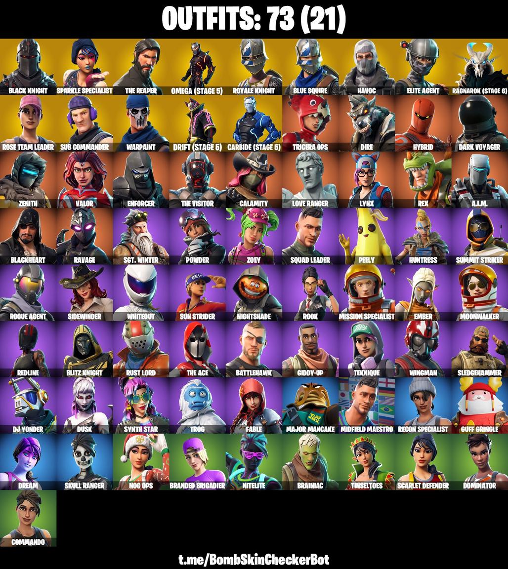 Black Knight | Sparkle Specialist | The Reaper | Omega | Royale Knight | Blue Squire | Havoc | Elite Agent | Ragnarok | Rose Team Leader | Sub Commander | Warpaint | Drift | Carbide | Tricera Ops | Dire | Hybrid | Dark Voyager | Zenith | Valor | Enforcer | The Visitor | Calamity | Love Ranger | Lynx | Rex | . | Blackheart | Ravage | Sgt. Winter | Powder | Zoey | Squad Leader | Peely | Huntress | Summit Striker | Rogue Agent | Sidewinder | Whiteout | Sun Strider | Nightshade | Rook | Mission Specialist | Ember | Moonwalker | Redline | Blitz Knight | Rust Lord | The Ace | Battlehawk | Giddy-up | Teknique | Wingman | Sledgehammer | DJ Yonder | Dusk | Synth Star | Trog | Fable | Major Mancake | Midfield Maestro | Recon Specialist | Guff Gringle | Dream | Skull Ranger | Nog Ops | Branded Brigadier | Nitelite | Brainiac | Tinseltoes | Scarlet Defender | Dominator | Commando |