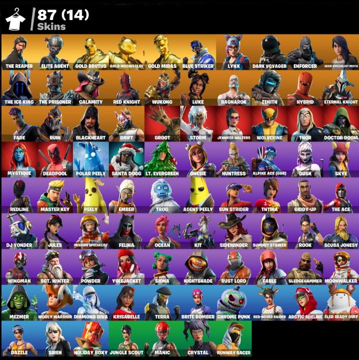 [PC PSN XBOX] 87 SKINS + THE REAPER + ELITE AGENT + GOLD MIDAS + TAKE THE L+ DRIFT + MAKO + ORANGE JUSTICE + FRESH