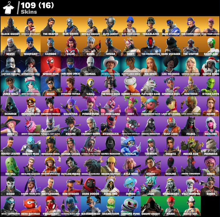 [PC XBOX] 109 SKINS + BLACK KNIGHT + SPARKLE SPECIALIST + FLOSS + THE REAPER + ROYALE KNIGHT + BLUE SQUIRE + OG STW