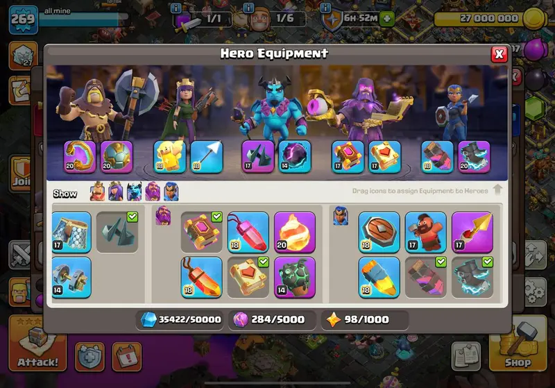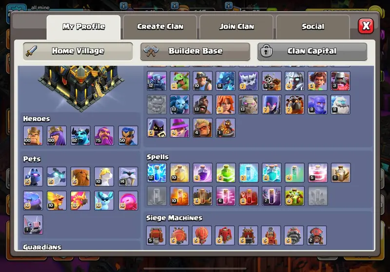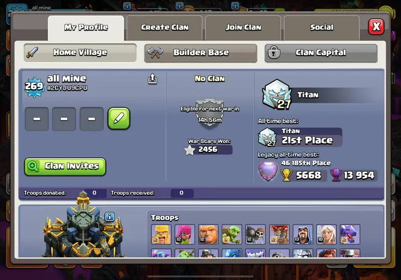 PvP Legend Ranked Account 💎 31 Equipment Pieces 💎 Town Hall 17 [] 269 XP [] Shadow Scenery - Heroes: 100-100-82-75-50 - Obstacle Collection - Instant Availability
