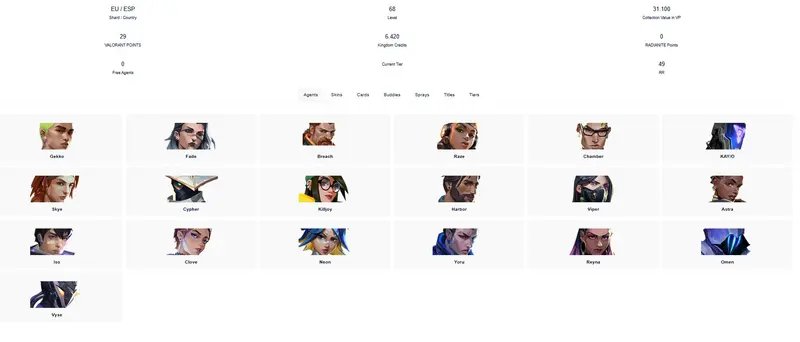 EU - LVL 68 - UNRANKED - 19 AGENTS -5 KNIVES -46 SKINS 31100 VP -Elderflame Vandal, Eternal Sovereign,Araxys Bulldog- FA