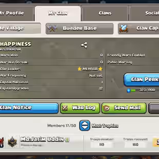 CLAN NAME [ HAPPINESS] CLAN LEAGUE [ MASTER 1] CLAN LEVEL [3] WAR LOG [ZERO-0] INSTANT DELIVERY